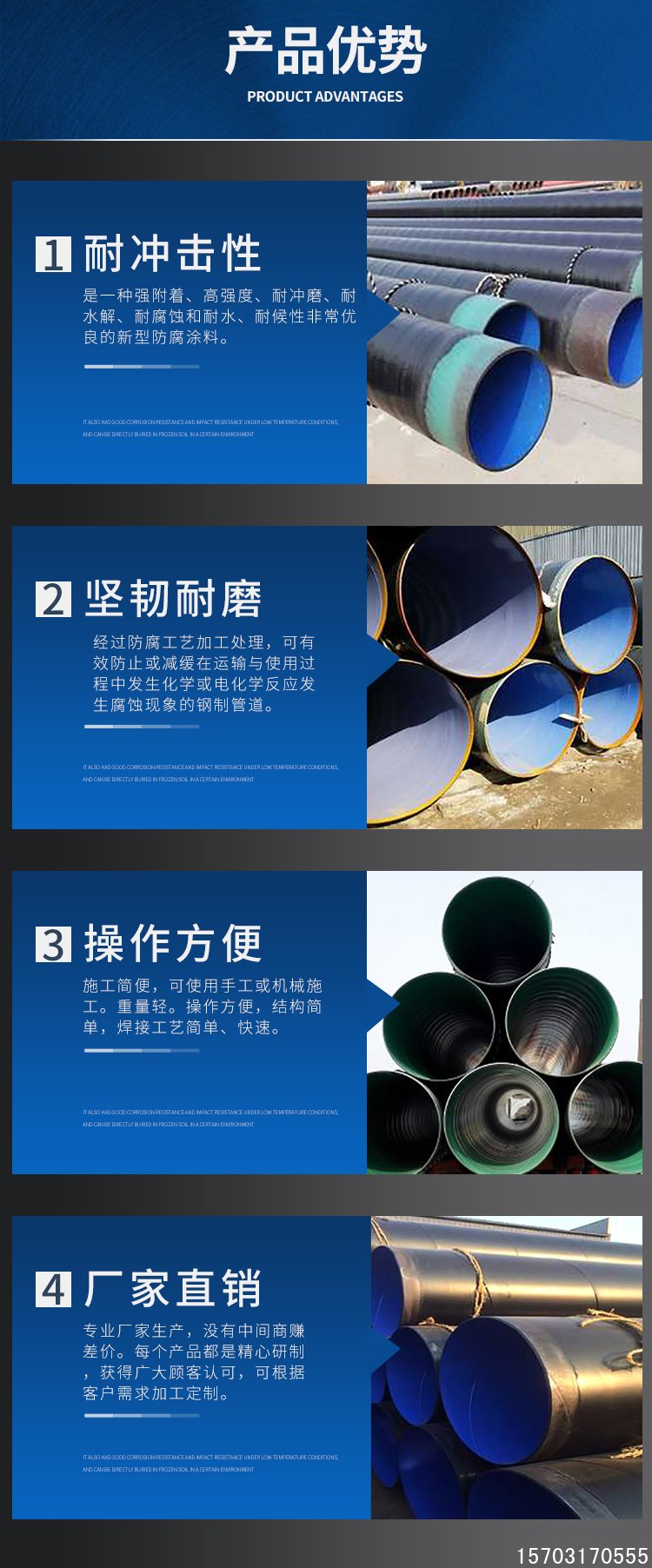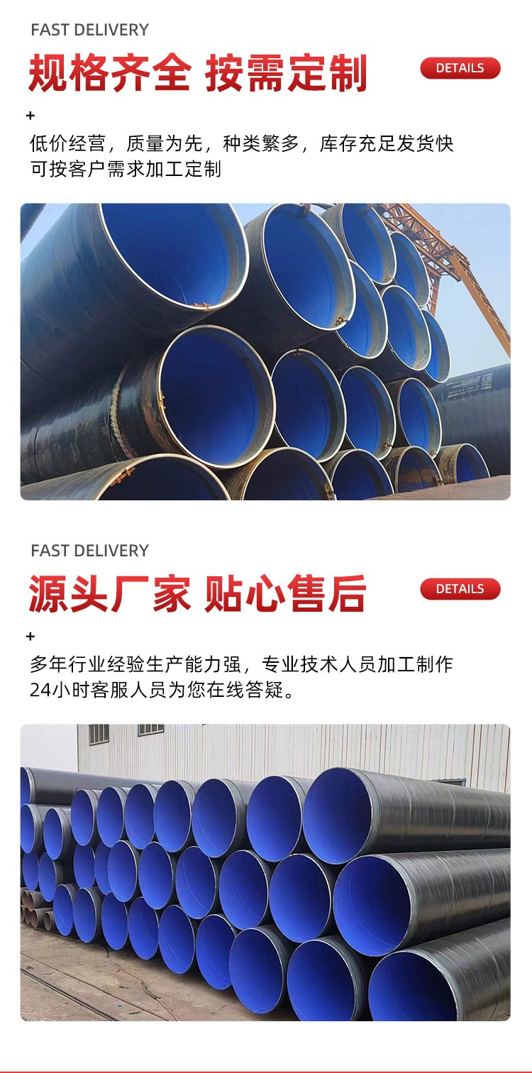 外壁采用热熔结缠绕工艺底层环氧树脂、中间层胶黏剂、外层聚乙烯形成三层结构的防腐层,内壁采用热喷涂环氧粉末防腐方式,将粉末经高温加热熔结后均匀地涂敷在管体表面上,形成钢塑复合层,极大提高了涂层附着力及涂层厚度,增强了耐磕碰,耐腐蚀的能力。
